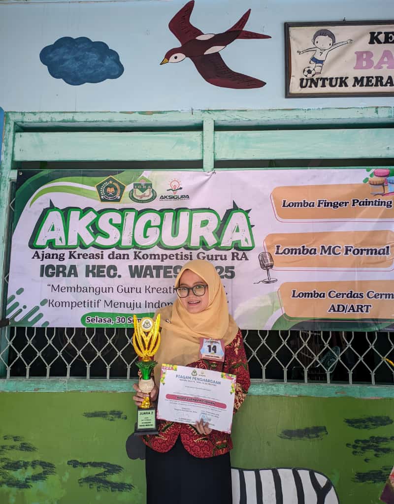 Wates, 30 September 2025 – Prestasi membanggakan diraih oleh Bunda Naifah Fathimah Az-Zahro (Bunda Imaz) seorang guru RA yang berhasil meraih Juara 2 dalam kategori Lomba MC Formal pada kegiatan AKSIGURA (Ajang Kreasi dan Kompetisi Guru RA) tingkat Kecamatan Wates.