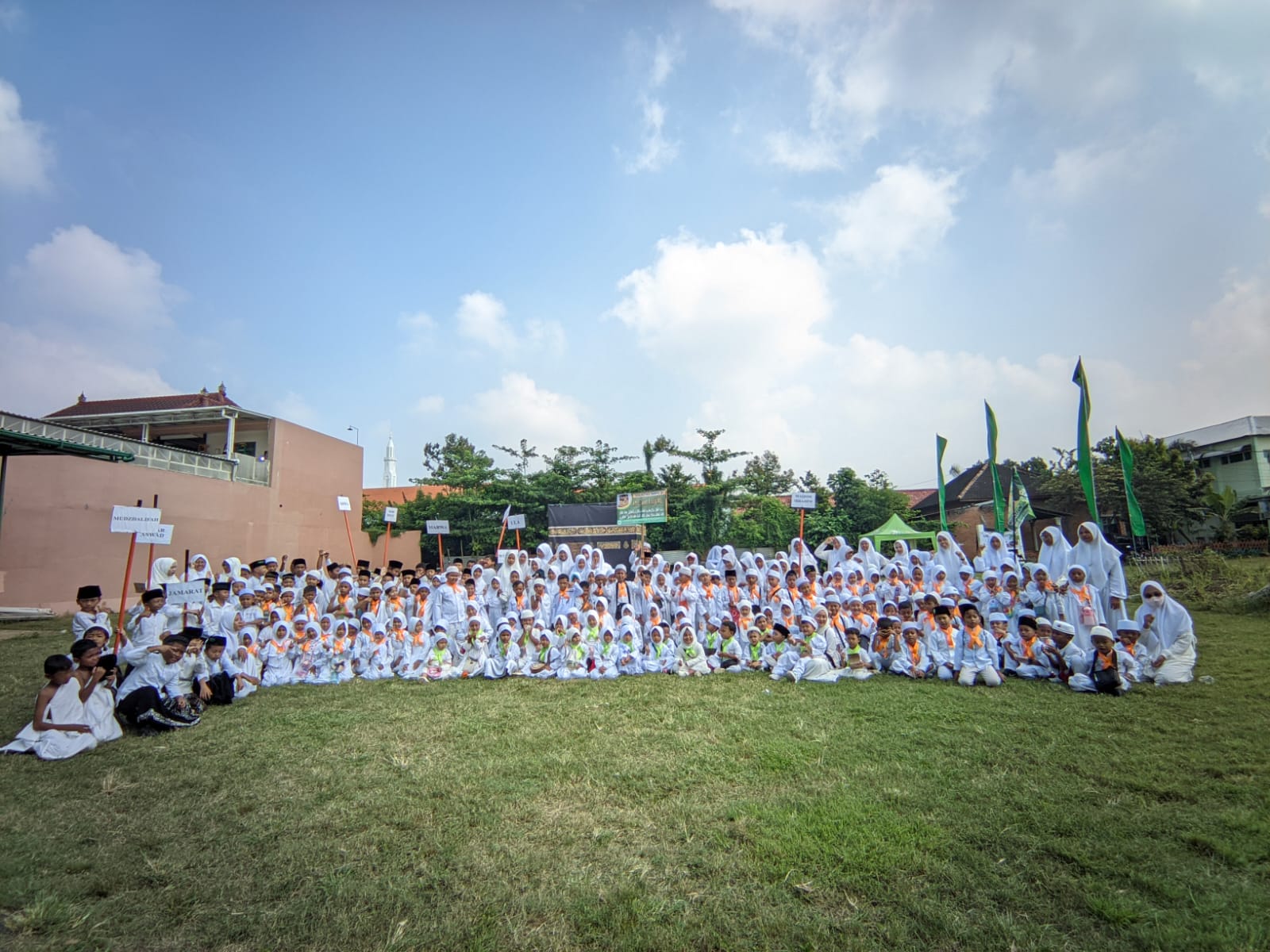 Sejak pagi, para peserta telah berkumpul di halaman sekolah PAUD dan RA dengan mengenakan pakaian ihram serba putih. Dengan didampingi para guru, anak-anak kemudian berjalan bersama menuju Lapangan MI Baitul Muttaqiin yang telah disulap menjadi simulasi kompleks tanah suci.